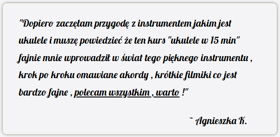 Przygodę z tym instrumentem postanowiłam rozpocząć ze szkoleniem ,,Ukulele w 15 minut" żeby sprawdzić, czy to jest dla mnie. Kurs był szybki, materiał łatwy do przyswojenia, a efekty widoczne od razu. Postanowiłam więc wykupić kolejny kurs - ,,Piosenki dziecięce na Ukulele", z racji tego, że jestem nauczycielem i pracuję z dziećmi. Przyznaję, że wkręciłam się w granie.